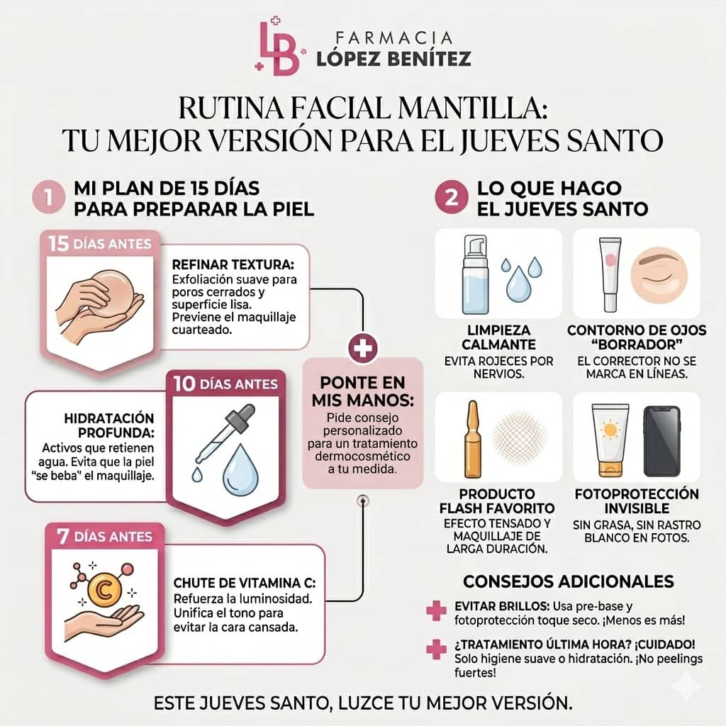 Este Jueves Santo, quiero que luzcas una piel a la altura de tu mantilla. Te espero en la farmacia para que diseñemos juntas el protocolo que te haga brillar con luz propia.