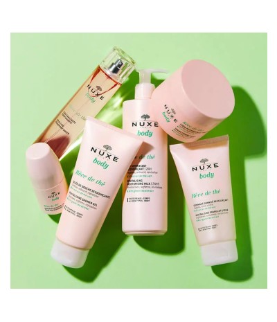 Té verde y ruibarbo, virtudes tonificantes y rejuvenecedoras: sucumba a la fragancia de NUXE Body Rêve de Thé para una sensación de frescor y bienestar.