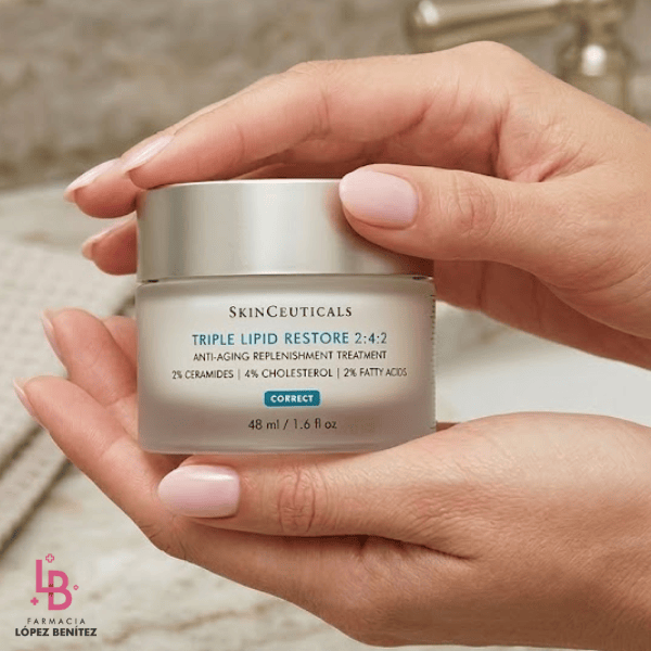 Desde Farmacia López Benítez recomendamos utilizar Triple Lipid Restore 2:4:2 como el compañero inseparable de tu tratamiento con Retinol 0.3 o 0.5, ya que su ratio de lípidos es el único capaz de reducir el periodo de adaptación a los retinoides, minimizando drásticamente la descamación y el enrojecimiento. No obstante, recuerda que para un protocolo de luminosidad total, su aplicación tras el sérum C E Ferulic por las mañanas crea una barrera infranqueable frente al daño ambiental y la deshidratación. Además, su textura ligera y fundente se absorbe sin dejar residuo graso, proporcionando una sensación de turgencia y confort que perdura durante 24 horas. Para concluir comentarte que en Farmacia López Benítez estamos a tu entera disposición para asesorarte en tu ritual de restauración lipídica avanzada.
